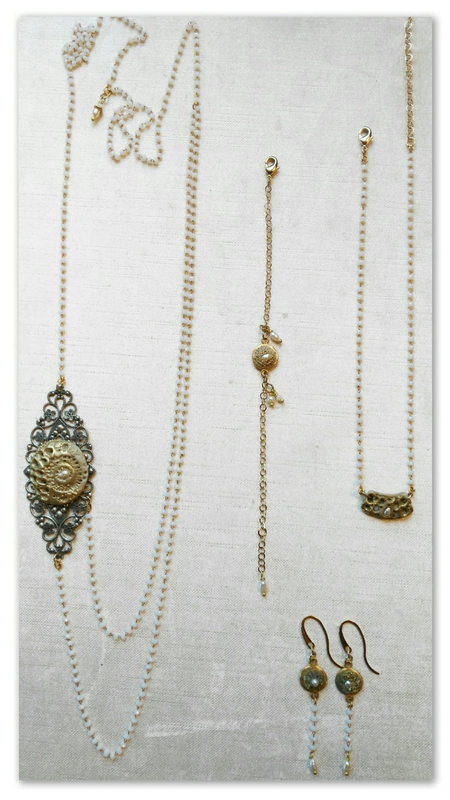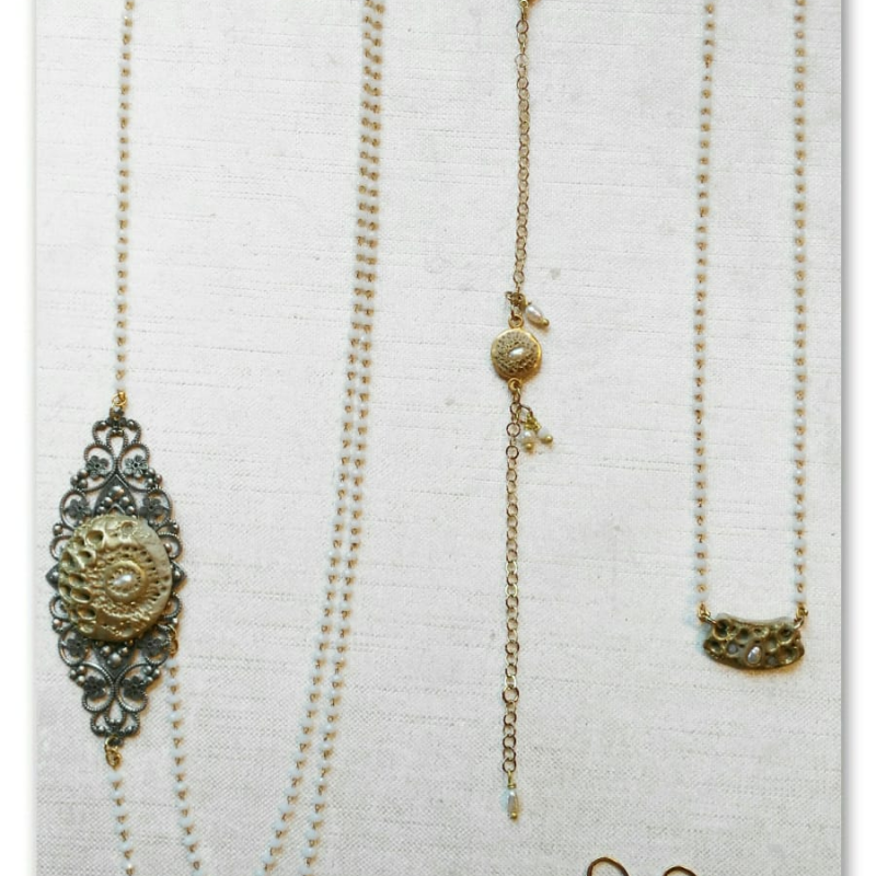 Bracciale con decoro in argilla polimerica e una perla di fiume incastonata, unitamente all'inserto di perle quali pendenti. Catena in ottone - Nichel free - cm.