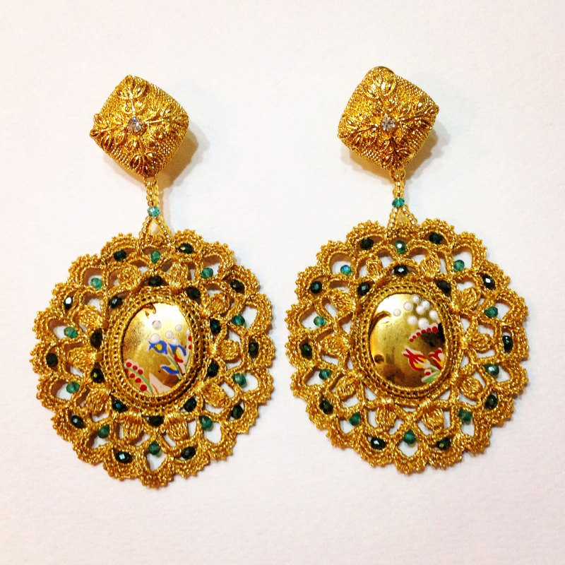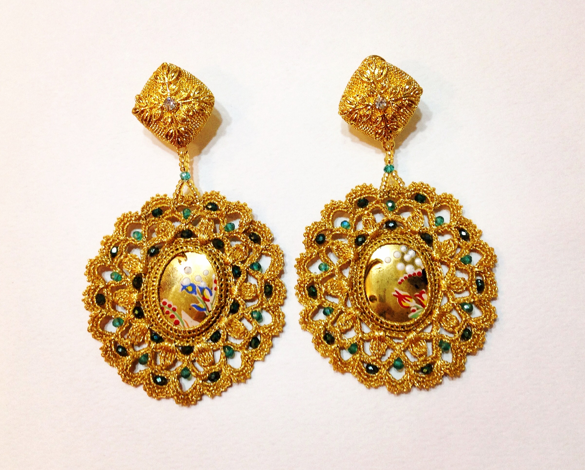 90.00 Orecchini in macramé eseguito a mano, con inserto di piastre antiche decorate a mano e cristalli