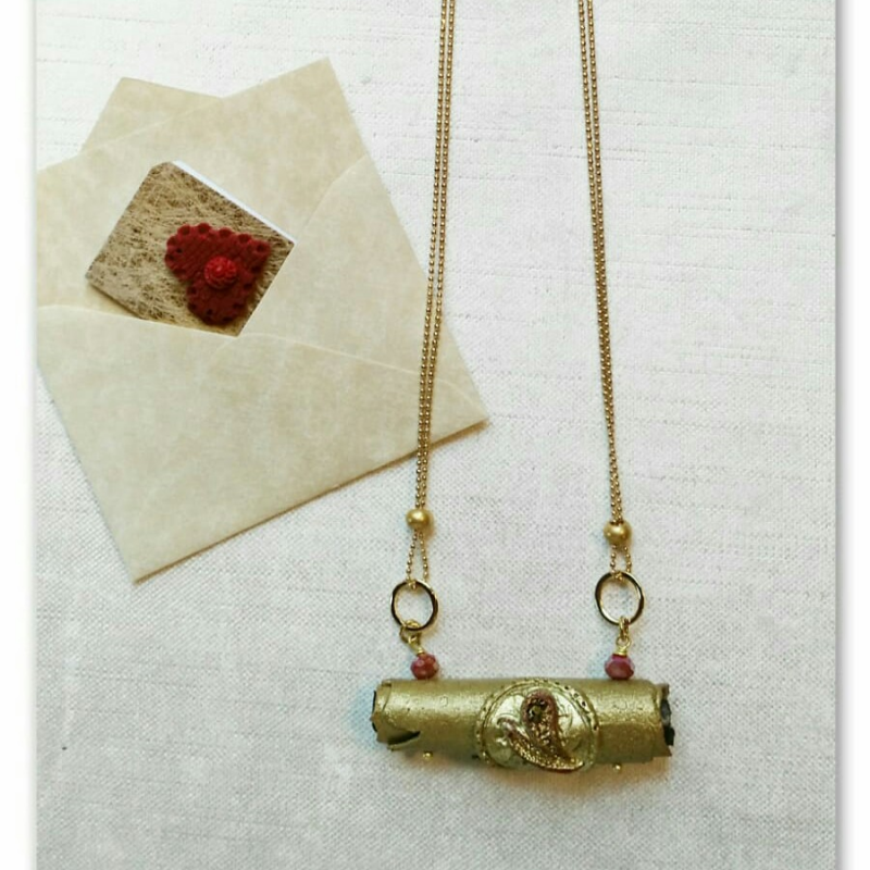 Collana realizzata in argilla polimerica, costituita da un cilindro decorato con cristalli in cui è possibile inserire un messaggio. Catena cm 80, nichel free